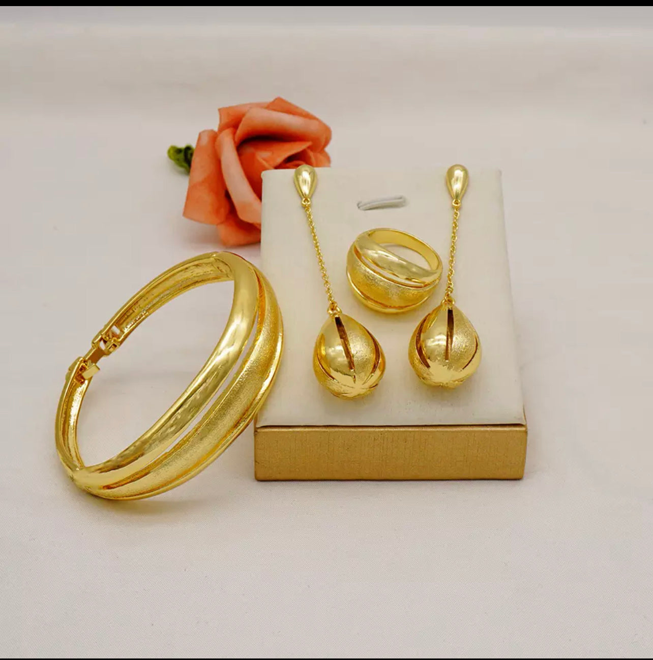 Special Design Luxury Shiny Brazilian Gold 24k Bracelet Earrings Ring For women Jewellery Set  For Party Wedding Bride Gift